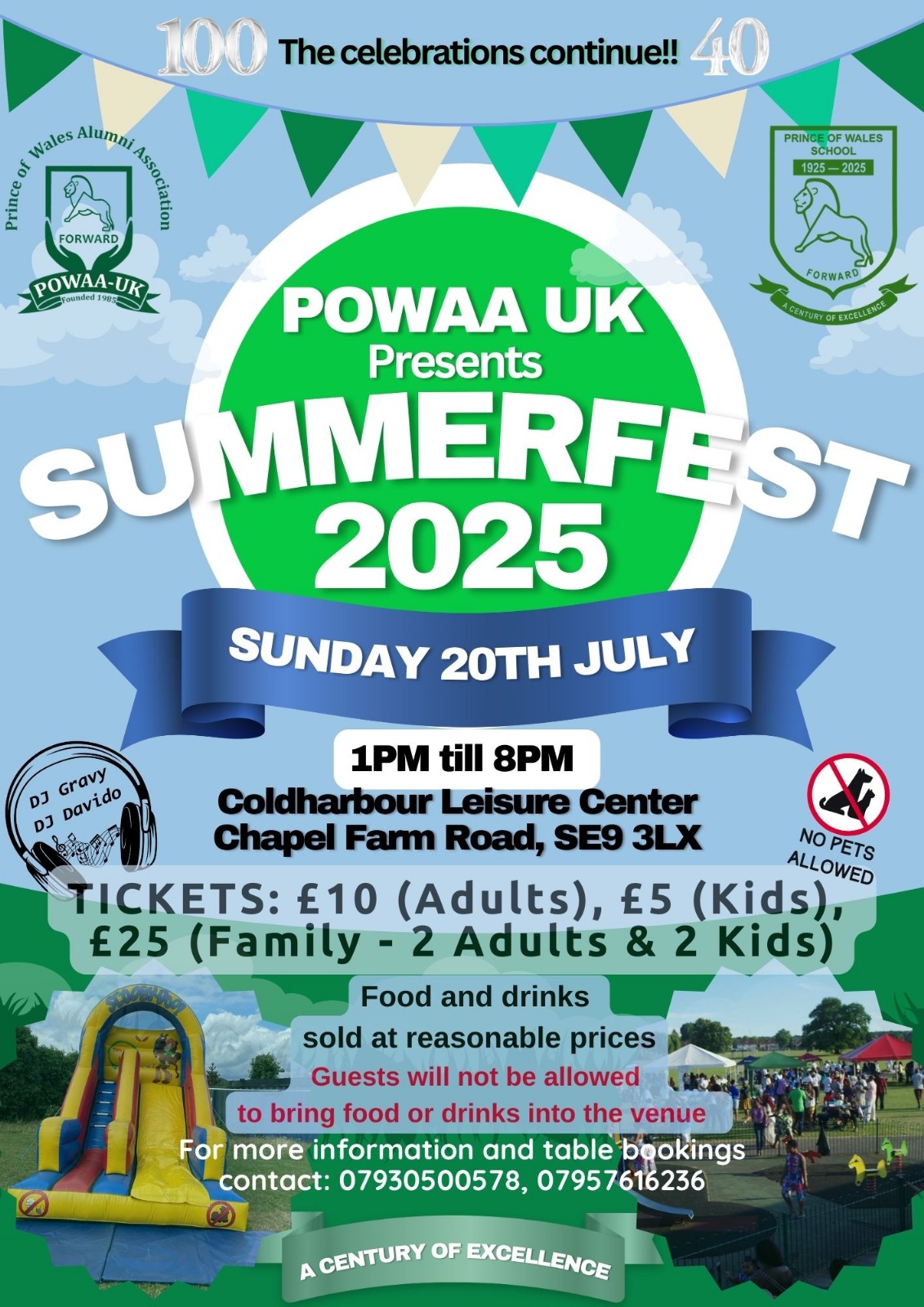 July 20 @ 1:00 pm - 8:00 pm POWAA UK Summerfest 2025 Coldharbour Leisure Centre, London, SE9 3LX Chapel Farm Road, London £5.00 – £25.00